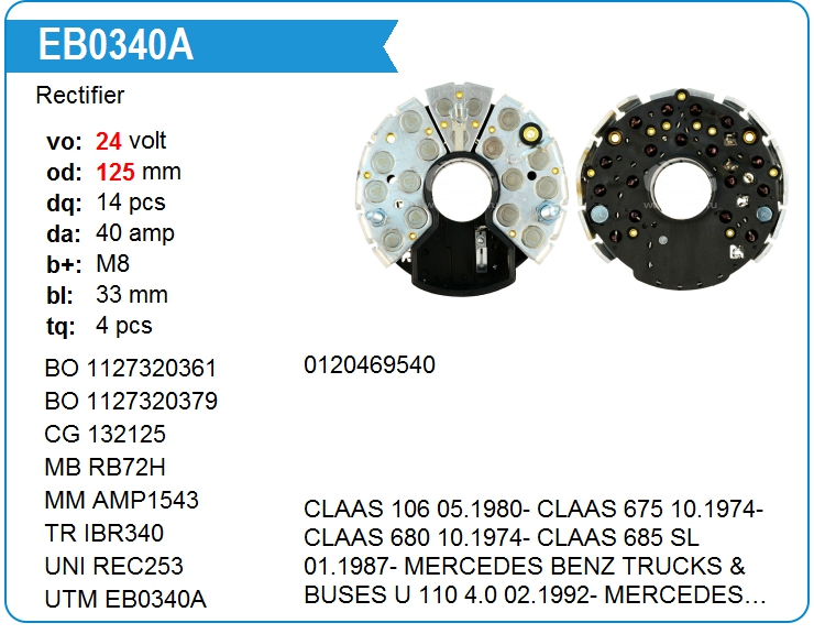 | UTM | EB0340A | Диодный мост генератора | ЕКБ | 1 | да | 7 200,00 руб. | |