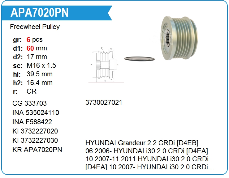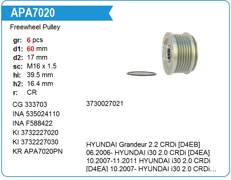 | KRAUF | APA7020PN | Шкив генератора обгонный | ЕКБ | 1 | да | 5 400,00 руб. | |