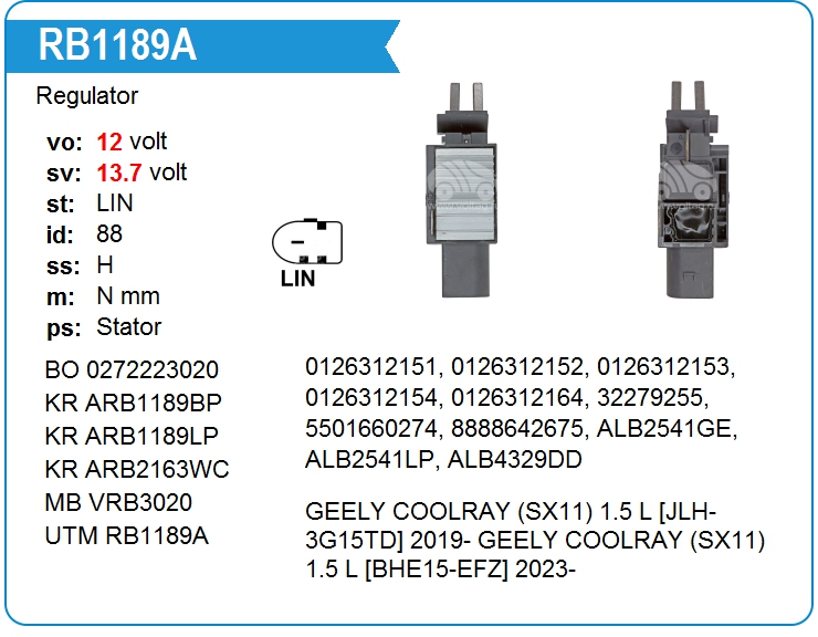 | UTM | RB1189A | Регулятор генератора | ЕКБ | 1 | да | 7 200,00 руб. | |